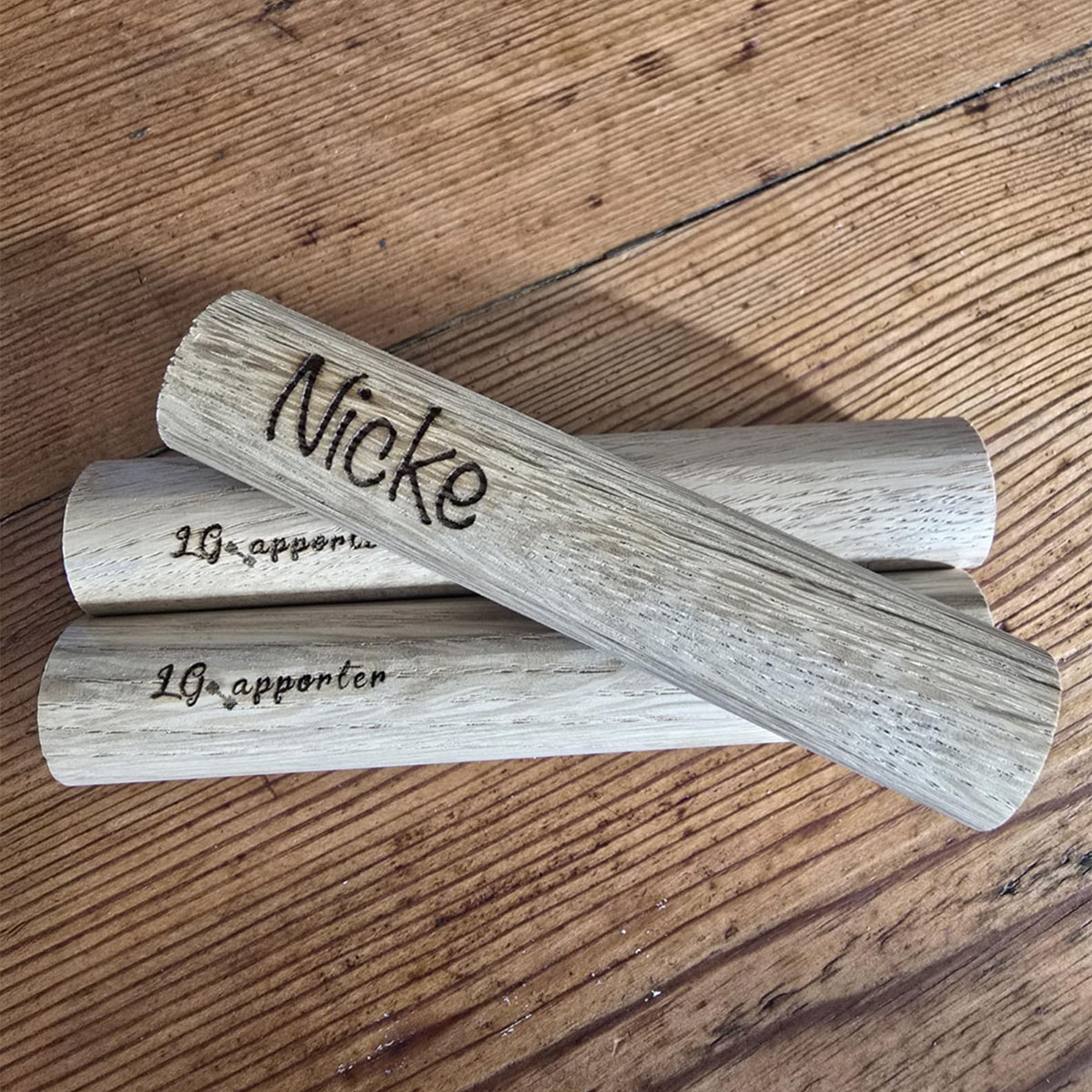 Få greppinnen på din nya apport graverad! Kanske önskar du din hunds namn, ditt eget eller varför inte ett citat? Du väljer mellan tre olika teckensnitt. Vi anpassar textens storlek och placeringen på greppinnen efter den mängd text du önskar.